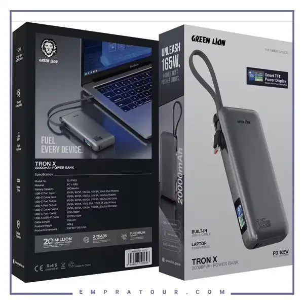 پاروبانک 165 وات 20000 با کابل تایپ سی گرین لاین GNTRX20P165GY یک پاوربانک پیشرفته و چندمنظوره است که با بهرهگیری از باتری با ظرفیت بالا و توان خروجی فوقالعاده، نیاز کاربران حرفهای را به انرژی در هر شرایطی پاسخ میدهد. این محصول ترکیبی از ظرفیت ذخیره انرژی مناسب، شارژ سریع و نمایشگر هوشمند TFT است که کنترل و مدیریت شارژ را به سطحی پیشرفته ارتقا میدهد. استفاده از کابل تایپ سی همراه، کاربری این پاوربانک را راحت و کامل کرده است.یکی از ویژگیهای اصلی این پاوربانک، ظرفیت باتری ۲۰۰۰۰ میلیآمپر ساعت آن است. این ظرفیت بالا به شما امکان میدهد تا دستگاههای مختلف را چندین بار شارژ کنید و از نگرانی بابت اتمام شارژ در طول روز یا سفر دور بمانید. ظرفیت ۲۰۰۰۰ میلیآمپر ساعت، تعادلی مناسب بین توان ذخیره انرژی و قابلیت حمل ایجاد کرده و باعث شده که پاوربانک هم برای استفاده روزمره و هم برای مواقع اضطراری مناسب باشد